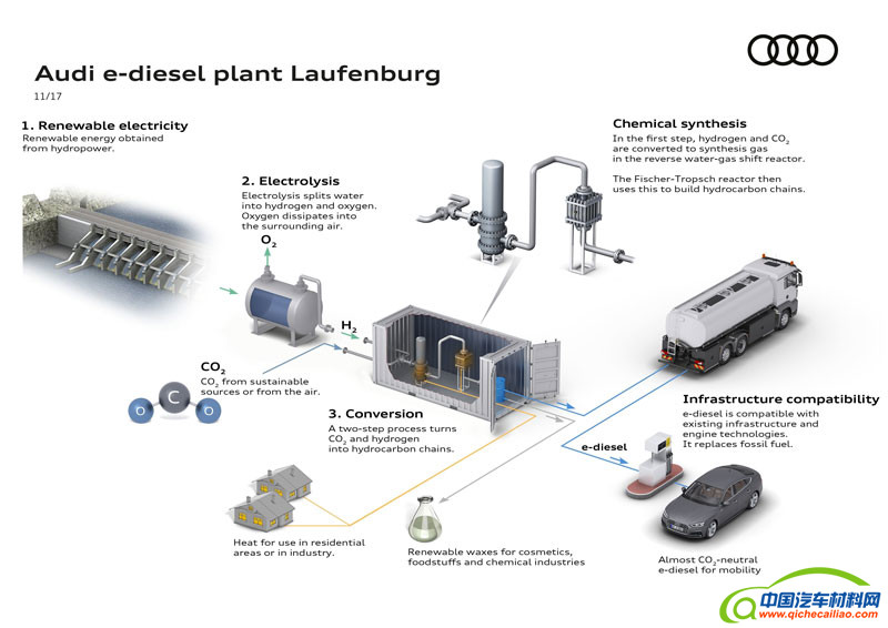 下图显示了该燃料的产出过程:首先将水电解成氢气和氧气。氧气释放到空气中,而氢气与从大气中吸取的二氧化碳结合形成碳氢化合物。接着这些碳氢化合物被分离并产出合成柴油燃料,据奥迪称,这些燃料还可以用于食品、化妆品和化工。整个生产过程以水力发电产生的富余能量为基础,且制造过程中产生的热量可以被捕获并传送到家庭或企业。