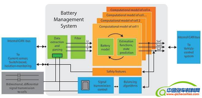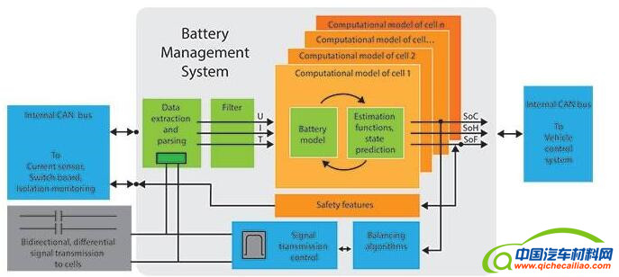 电动车的电池是一种高度非线性的系统,会持续不断地改变状态。了解电池每个单体的变化对优化电动车的性能极为重要。电池中包含多种类型的传感器,用于监控自身的运行。同时BMS与这些传感器连接,以测量电压、电流、温度和其他参数。但是无法为了全面了解电池状况而装入足够多的传感器,因此BMS使用复杂的算法来估算电池的充电状态(SOC) [等同于电池组的油量表]、健康状态(SOH) [电池状况与理想状况的对比]、使用寿命状况(SOL) [电池的剩余使用寿命]和其他重要参数。