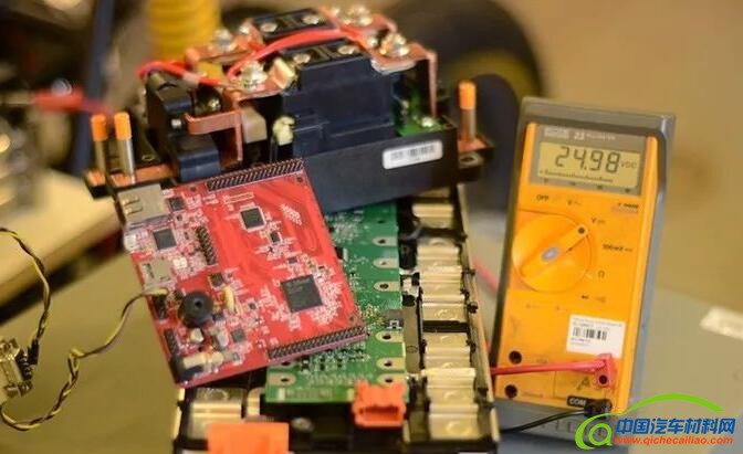 BMS主控制器嵌入式硬件(红色)位于BMS从控制器(绿色)的上方,后者位于电池演示器的上方。从控制器测量单体电池电压和温度,执行单体电池平衡策略。高压电池断接开关(背后的黑盒子)负责电池与负载间的通断。