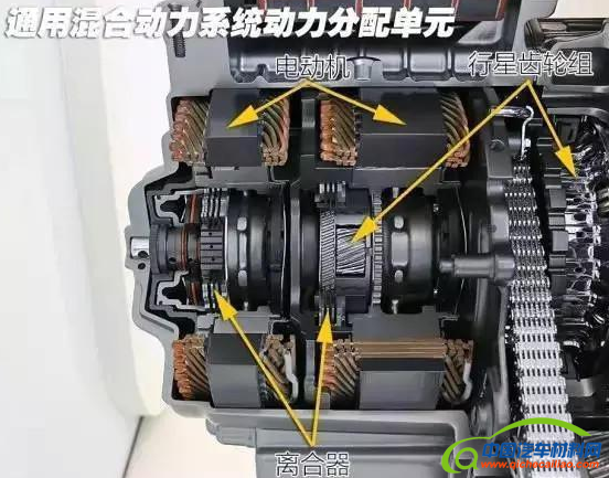 这套系统是由2个电机和1套行星齿轮组成的,通过连续的电控调速来实现变速,上图的MG1电机和MG2电机,分别是用来调速和驱动电机的,然后通过这套行星齿轮与发动机相连进行变速,当MG1电机的转速达到一定范围,车速高于一定值的时候,发动机就会启动。