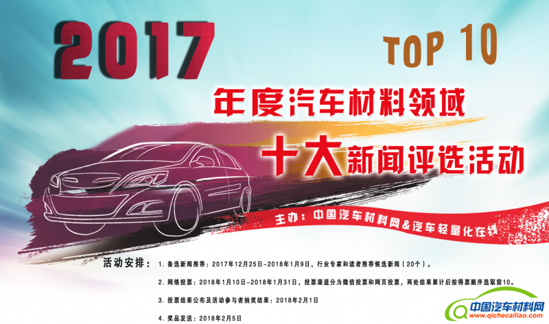 为使广大读者及网友更加全面了解2017年汽车材料领域相关信息,中国汽车材料网与汽车轻量化在线一年一度联合推出的“年度汽车材料领域十大新闻评选活动”又开始啦!2018年即将到来,希望通过此次评选活动,盘点过去汽车材料行业的大小事,共同见证汽车材料领域的进步与发展。2017年度汽车材料领域十大新闻评选活动,热切期待您的参与!