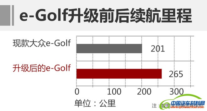 大众曾豪言:截止到2025年,大众全球销量中,四分之一都将是电动汽车。若想实现这一目标, 提高续航里程是一大关键。现款e-Golf配备了35.8千瓦时的电池组,最大续航里程为201公里。再次提升后,搭载48千瓦时电池组的新e-Golf续航表现将提升32%,最大续航里程达到265公里。
