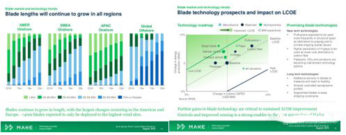 在风能领域,碳纤维的路可能不会太顺,已经不止一位发言人指出,风力发电机制造商正在寻找高模量玻璃纤维而不是碳纤维。美国能源部桑迪亚国家实验室的转子气动弹性主管BrandonEnnis引用市场信息咨询公司MAKE提供的数据进行分析,提出价格和供应链问题以及制造敏感性问题正是风力涡轮机制造商努力摆脱碳排放的原因。