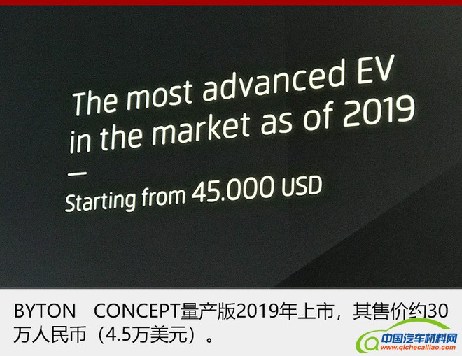 全新概念车命名为BYTON Concept,新车基于全新电动车平台打造,提供后驱和四驱两种版本,最大续航里程达529公里。此外,基于BYTON Concept概念车打造的量产版将于2019年下半年上市,预计起售价约为30万元人民币(4.5万美元)。