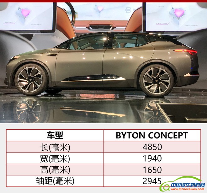 拜腾首款SUV定位豪华智能中型SUV,车身尺寸为4850*1940*1650毫米,轴距为2945毫米,同时新车还采用了短前悬的设计,使其在内部空间方面拥有极大的优势。此外,BYTON Concept还配备了可旋转座椅、可触控方向盘及端到端屏幕。