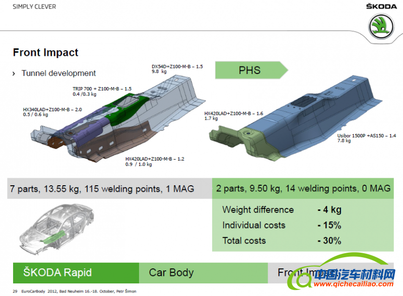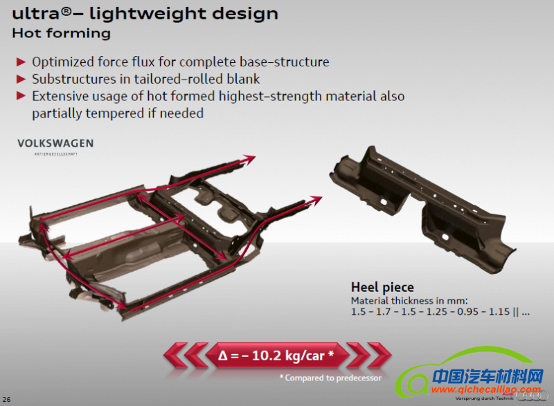 前底板中通道设计对侧面碰撞有很大的影响,一直是一个难点问题,从今年SKODA和AUDI车身可以发现一个共同点——采用了热成型材料和工艺,提高了材料强度并减少了零件数量。