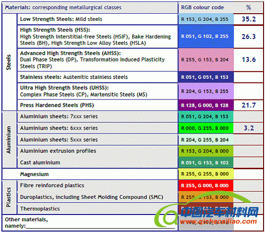 下表为Audi A3白车身总成的整个用材种类及分布情况