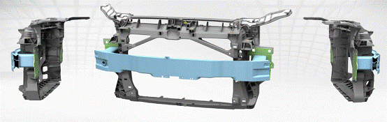 塑料前端模块采用全塑的结构,集成度比较高,框架内增加两个加强筋,以支撑锁扣的冲击力。材料PA GF30,官方未提及是采用长纤维还是短纤维。