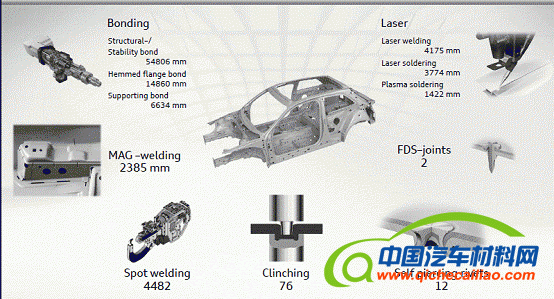 A3的车身除了采用钢板,还采用了铝合金材料和塑料复合材料等。因此除了传统点焊,还有弧焊、胶粘接、铆接、激光焊接、冲压连接和自攻螺钉连接工艺得等,其中激光焊接技术应用达到约8m,胶粘接达到78米,对于提升车身的刚度起到了关键的作用。国内车身胶接连接面前基本在30-40m左右。如果要提升车身刚度、车身的气密性(改善NVH),这方面还有很大的提升空间。