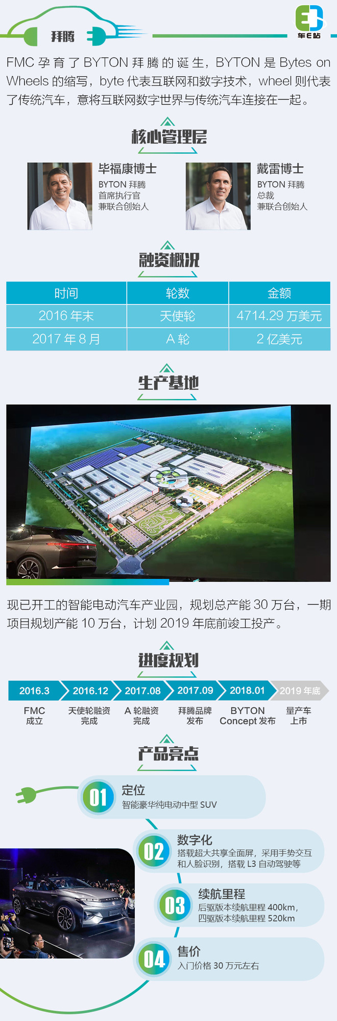 核心管理团队方面,毕福康博士在行业里如雷贯耳,加入拜腾前,他曾是宝马集团工程副总裁、i8项目总负责人,他被业界称为“i8之父”。戴雷博士是中国豪华汽车领域经验最为丰富的高管之一,是业界公认的中国通。戴雷博士曾任英菲尼迪中国总经理及东风英菲尼迪汽车有限公司总经理。此前,他曾担任华晨宝马营销高级副总裁。