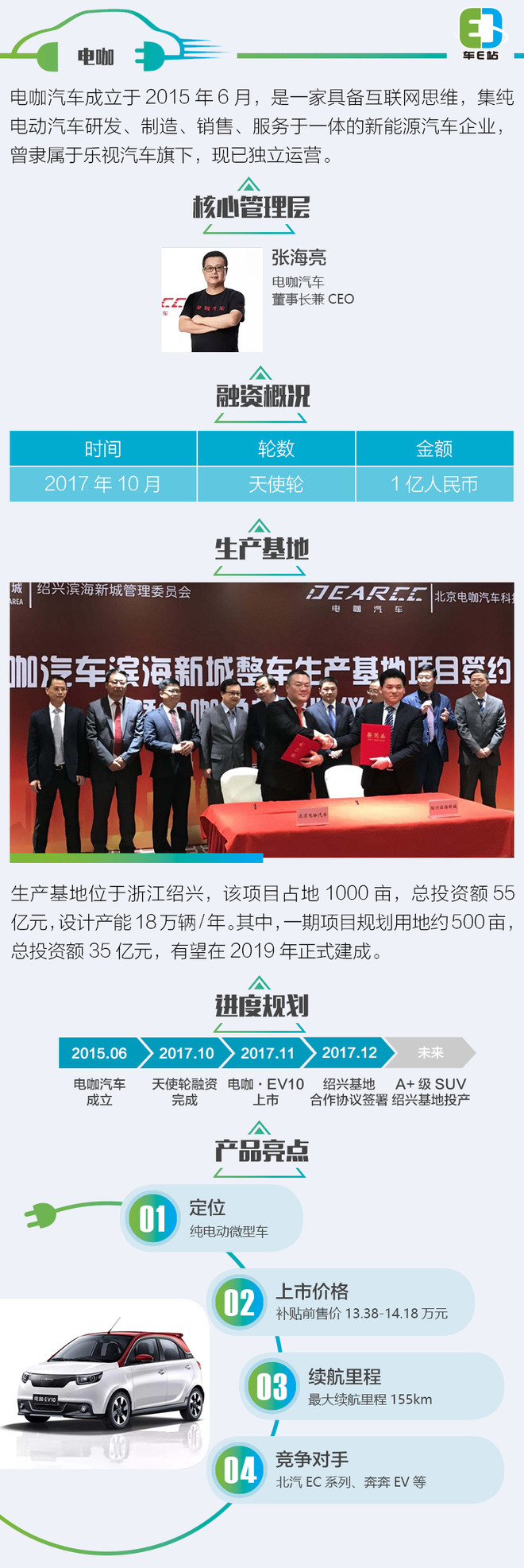 管理团队方面,张海亮曾担任上汽集团副总裁、上汽大众总经理、上汽大众汽车销售有限公司总经理等职位,在2016年4月加盟乐视汽车,任职乐视超级汽车(中国)总裁兼COO。2017年3月,张海亮升任为乐视超级汽车(LeSEE)全球CEO。去年10月,张海亮正式执掌电咖汽车。