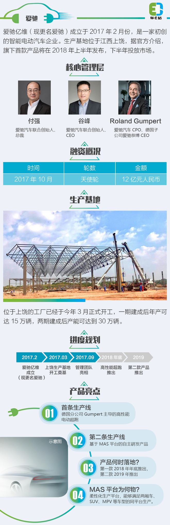 就在几天前,爱驰亿维刚刚更名为爱驰汽车,从官网也可以看到相关的调整。2017年初,爱驰亿维正式成立,宣布将专注于纯电动车的发展。不过,目前爱驰汽车还不具备生产资质,对此付强表示:“关于生产资质,目前我们正在申请中,同时我们也在谋求和传统汽车企业进行合作,这也是工信部鼓励的行为。我相信,只要认真做产品,认真做企业,生产资质问题一定会水到渠成。”此外,爱驰汽车的电池将由宁德时代提供,车联网系统供应商为四维图新,充电设施则与星星充电合作。