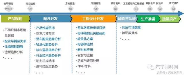 以整车开发为例,在产品规划阶段,大数据将提供车型市场销量、性能指标趋势、外观设计趋势等,为新产品的规划和目标市场的设定提供数据参考。在概念开发阶段,可基于大数据了解整车配置趋势、轻量化发展趋势、高科技产品配置趋势等。通过核心竞品信息分析、行业技术趋势分析,为产品性能目标的确定、外观尺寸的设计、各系统配置的选择提供依据。在工程设计阶段,则可以根据新产品的规划和目标,在数据库中直接筛选相应的材料和工艺,以达到相应的目标水平。如,各系统的重量对标、轻量化方案选择、零部件选材、新材料应用等。在试验与认证阶段,通过建立验证数据库,为产品性能优化提供参考。因此,汽车大数据也相当于一个汽车行业的资源库,在整车开发过程中必不可少。