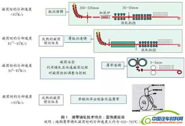 目前,RAL正与我国钢铁企业密切合作开展薄带连铸GO、NGO、高硅钢产业化技术研究。通过在实验室条件下,系统开展薄带连铸硅钢“化学成分—工艺—组织性能”演变及控制技术研究,开发出薄带连铸关键单体设备和核心控制系统,形成了具有我国自主知识产权的薄带连铸高品质硅钢成套工艺与装备技术,为在国际上率先实现薄带连铸硅钢的工业化生产提供了重要支撑。薄带铸轧技术最本质的问题是,利用铸坯成型过程不同的凝固冷却速率,产生凝固组织的差异,并对其进行有效控制,其特点为亚快速凝固(如图1)。已取得的成果包括: