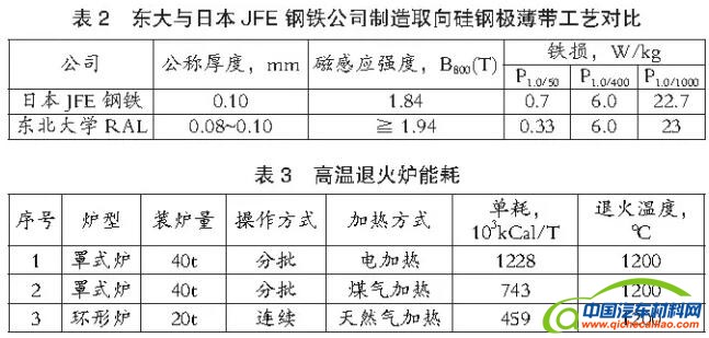 新日铁公司曾以AlN作抑制剂,进行过高温连续炉试验,不涂MgO,表面无底层,二次再结晶基本完成,但仍残留更多的初次晶粒孤岛,加上时间短,不易净化除去N,因而磁性低,再说板温高于1000℃,成本高,如钢带运行速度为50m/min,时间15min则炉长750m,显然工业化生产是不可能的。JFE公司采用不涂覆退火隔离剂生产取向钢的新方法,要点是板坯加热到1250℃热轧,热轧板坯经800-1100℃退火处理,再经二次冷轧工艺,在二次冷轧之间加中间脱碳(或不脱碳)退火,目的是首次再结晶处理,首次再结晶处理后,在700-1000℃进行二次再结晶退火处理,但退火时间必须在5h以上,随后不采用退火隔离剂进行连续最终退火,处理温度在1100℃以上,退火时间在10min以内获得优良磁性,退火气氛可用H2、Ar等,最终得到产品厚度0.20mm,其铁损P17/50在0.584-0.648W/kg。