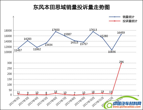 数据显示,2018年1月,思域的投诉量高达296宗,环比增长了近22倍!更可怕的是,这个数字还在不断增长中。从思域近一年来的销量投诉量走势图中可以看到,在2017年10月创造销量新高后,思域的销量便连续2个月下滑,直至2018年1月才有所回升,但又遭遇到“机油门”事件, 加之厂家对于产品缺陷问题的不作为,让人为思域未来的命运捏了一把汗。
