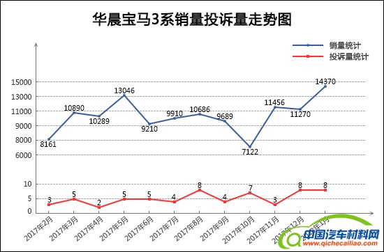 与奥迪A4L相比,宝马3系近一年来的销量走势颇为波折,但总体来说,依旧保持了月销过万的成绩。在过去的2017年,作为宝马主销车型的宝马3系贡献了14.3万辆的成绩,同比增长24.3%,助力宝马实现年销量同比增长15.1%的好成绩。进入2018年,宝马3系同样取得了开门红,1月份14370辆的成绩创造了近一年来的销量新高,同比增长25.2%。从宝马3系近一年来的投诉情况来看,月投诉都保持在个位数,可以说在质量口碑方面的表现在BBA中拥有绝对优势。进入2018年,BBA之间的竞争将进一步达到白热化,奥迪和宝马均有超过10款产品推出,冠亚军之争还将在两者间持续,谁胜谁负尚无法预测,但优秀的产品力加上稳定的质量口碑无疑会是夺冠的利器。照此来看,宝马3系的销量或将稳中有升,再上一个新台阶。