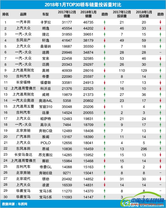新年伊始 万象更新。2018年首月的TOP榜单较2017年12月发生了较大变化,共10款新上榜车型,全部为合资品牌车型。其中,奥迪A4L、奔驰C级和宝马3系再次聚首,上一次三款车型齐聚榜单还是在2017年8月。2017年奥迪上演大逆转夺得豪华品牌销冠,可以说对奔驰和宝马打击不小,2018年开年三个品牌的主销车型便相聚TOP榜单,不难看出,2018年BBA之间的竞争白热化态势将进一步升级。从榜单前十名来看,与2017年12月份相比变化同样明显。捷达和卡罗拉重返TOP榜单前十名,其中卡罗拉凭借46735辆的好成绩拔得头筹,只不过其忽高忽低的销量表现,着实让人有些看不懂。此外,宝骏310和领动未能延续此前的销量表现跌出榜单前十;吉利帝豪则牢牢占据前十的位置,令人欣慰。