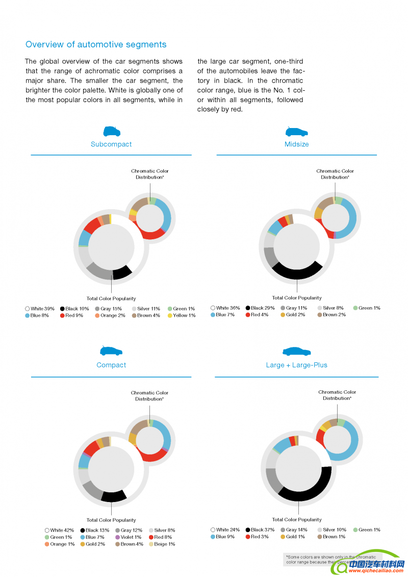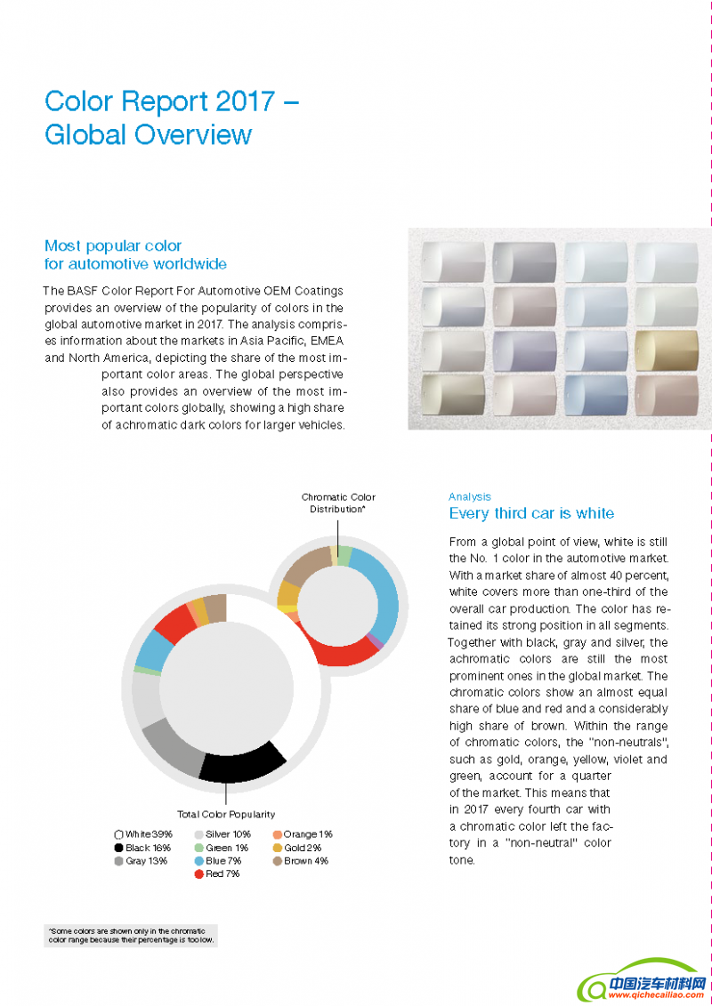 巴斯夫涂料部日前发布《巴斯夫汽车外饰涂料色彩报告》,对 2017 年全球汽车市场的色彩分布情况进行了分析。从全球来看,白色在所有细分领域遥遥领先,以 接近40% 的市场份额继续保持首选颜色的地位不变;并与黑色、灰色和银色等其它中性色共同占据市场主流。在彩色中,蓝色和红色的份额不相上下,棕色紧随其后。从全球汽车细分市场来看,车型越小,色彩越鲜艳。
