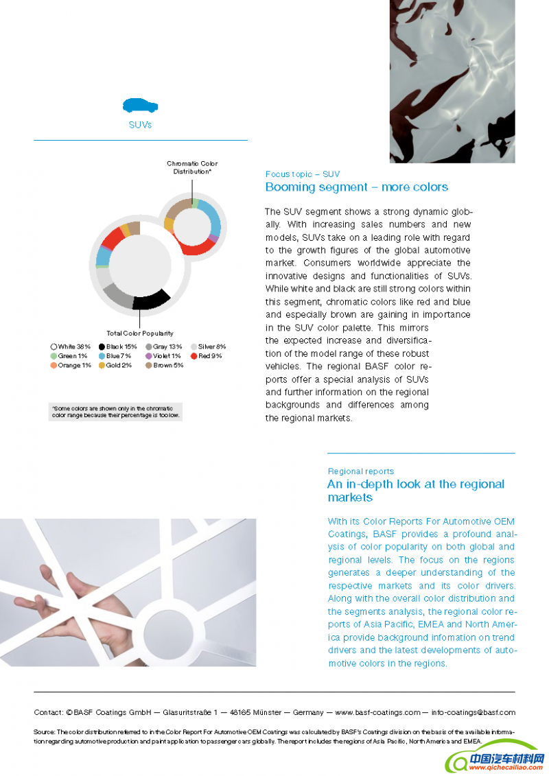 巴斯夫涂料部发布的《巴斯夫汽车外饰涂料色彩报告》旨在分析全球汽车市场的色彩分布情况,与每年发布的《汽车色彩趋势报告》互为补充。后者侧重于影响未来汽车市场的色彩趋势,前者则着眼于当前市场情况,主要参考上一年的数据。过去几年里,色彩种类极大丰富,为创新色彩方案提供了全新的可能。因此,巴斯夫与整车厂密切合作,创造独特的外观和触感,彰显汽车品牌精髓。目前汽车使用的几百种颜色中,除各种独特效果的选择外,涂料的功能性也日益重要。例如,具备温度管理功能的涂料能够减少汽车表面的热量积聚,防止车内温度升高,从而减少空调使用,降低油耗,延长电动车续航里程,因此有助于推动未来可持续交通的发展。