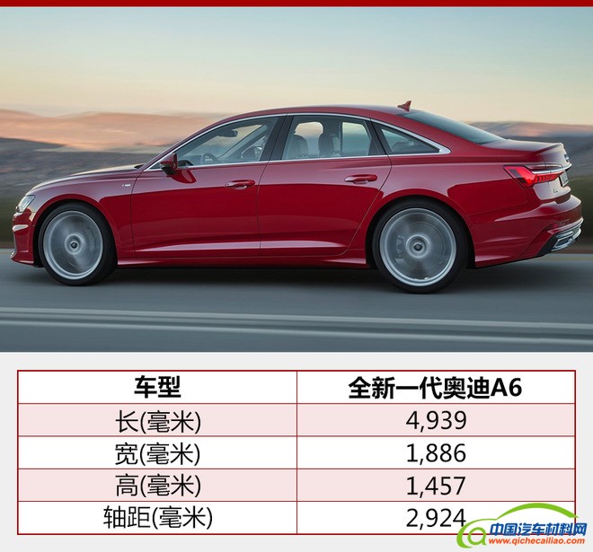 全新一代奥迪A6在车身尺寸上有所增加,长度增长7毫米至4,939毫米;宽度增加12毫米至1,886毫米;高度方面为1,457毫米,较现款车型增长了2毫米;轴距也增长至2,924毫米。