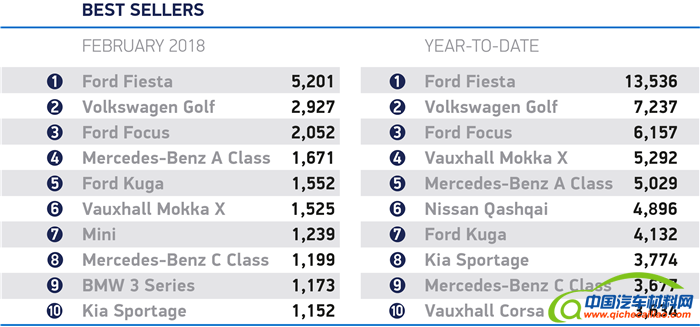 2月份及1-2月份的畅销车型对比来看,前三名的车型相同,分别是福特嘉年华、大众高尔夫和福特福克斯。福特嘉年华上月售出5,201辆,遥遥领先于排名第二的高尔夫,高尔夫上月仅售出2,927辆。福特福克斯以2,052的交付量紧随其后。