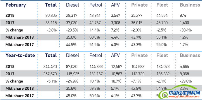 1-2月份来看,英国新车市场的总销量跌幅达到5.1%,总计售出244,420辆。其中商务购车、个人购车和批发购车量均出现下滑,跌幅分别达到29.8%、7.1%和2.1%。同时,汽油车和新能源车两位数的增长幅度也未能抵挡住柴油车的下滑颓势,柴油车目前的市场占比仅为35.6%。而这种需求量的偏差也表示柴油车车主或将长时间的持有其老旧车型。