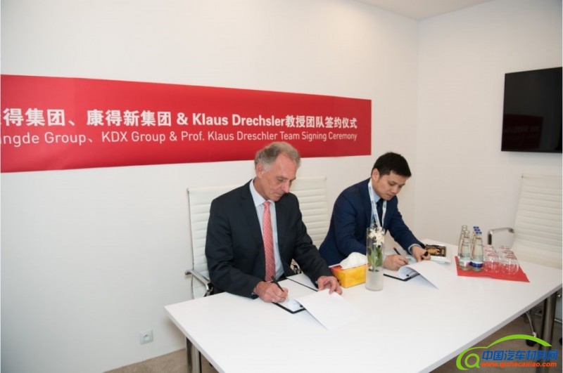康得复材副总裁、康得新欧洲复合材料研发中心总经理何鹏博士(右)和慕尼黑工大Klaus Drechsler 教授(左)签订协议