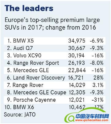 根据JATO Dynamics提供的数据显示,去年欧洲大型豪华SUV的销量下滑8.8%,售出246,573辆。在欧洲大型豪华SUV销量前十榜单当中,仅路虎发现和揽胜两款车型的销量出现增长。