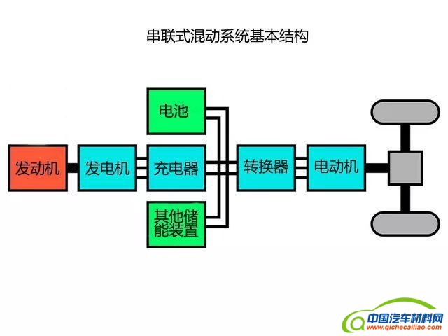串联式混合动力 的特点是结构简单,动力系统由发动机、发电机和电动机三部分动力总成串联组成。发动机驱动发电机发电,电能通过控制器输送到电池或电动机,由电动机通过变速机构驱动汽车。