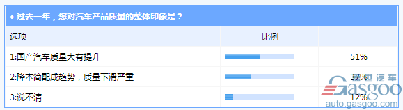 调研数据显示,有近半参与者表示,国产汽车经过数年来年的发展与沉淀,质量大有提升。据市场研究机构J.D. Power(君迪)最新发布的2017中国新车质量研究(IQS)显示,中国自主品牌与国际品牌新车质量的差距连续第七年缩小,2017年两者的每百辆车问题数(PP100)已进一步缩小至仅13分。从2000年J.D. Power第一次开展中国新车质量研究至今,自主品牌与国际品牌的PP100差距已从396分缩小至13分。
