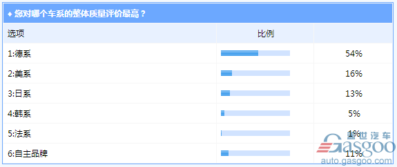 与此同时,在对六大车系的整体质量进行评价时,自主品牌凭借占比11%的选票支持排名第四。但是从上表可知,自主品牌在与几大主流车系同台竞技的过程中,仍有较长一段距离要追赶。另外,整体质量评价排在前三的分别是德系、美系和日系。