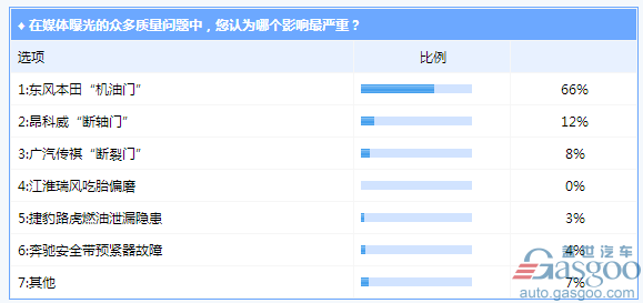 除了对当下汽车产品的质量现状有所了解外,调研还列举了时下曝光度较高几大质量案例,欲了解其影响程度。结果不出所料,人尽皆知的东风本田“机油门”事件获得了一边倒的怒怼,反倒退化了昂科威“断轴门”、广汽传祺“断裂门”等危及车主生命安全等事件的严重度。
