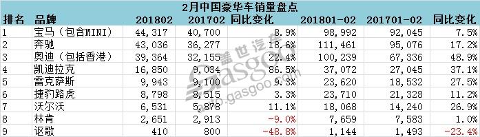 在所统计的豪华车品牌中,凯迪拉克上月同比增幅最大,达86.5%,2月总销量也从去年同期的9,034辆上涨至16,850辆,连续两年实现单月销量两位数增长。今年前两个月,凯迪拉克在华累计销量较去年同期净增10,000辆。