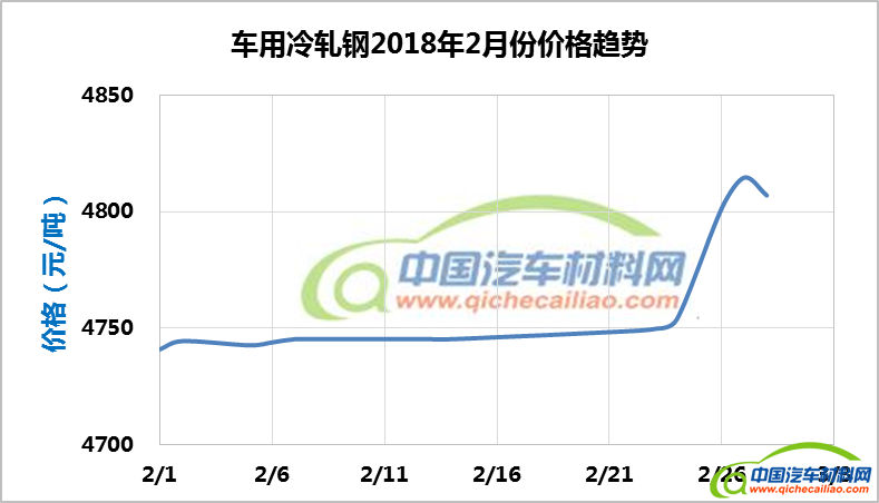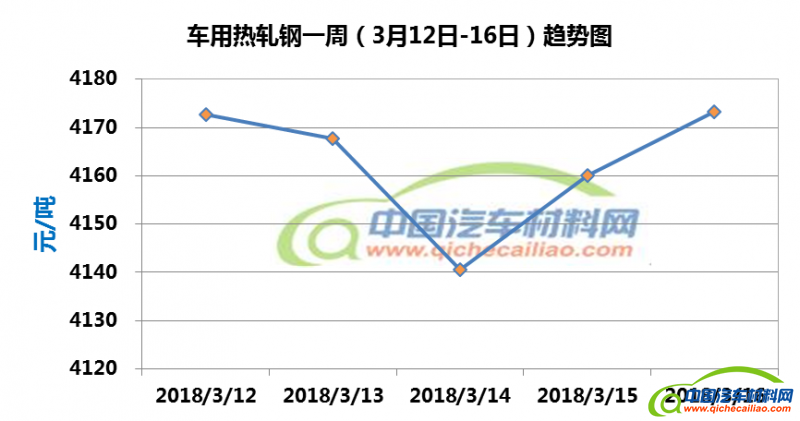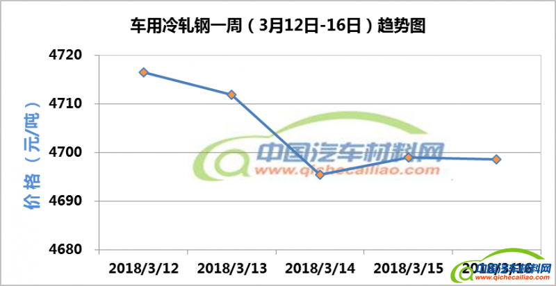 冷轧钢本周价格总体呈下跌趋势,一周内跌幅为17.92元/吨,其中3月12日-14日,价格下跌明显。车用冷轧钢本周平均价格为4701.25元/吨,较上周下跌1.34%,较2月份均价下跌1.17%。