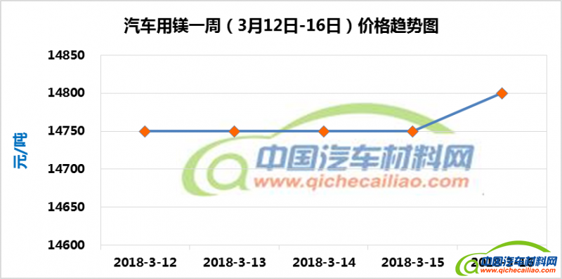 汽车用镁本周价格稳中有升,一周内有50元/吨的小幅增长。汽车用镁本周均价为14760元/吨,较上周下跌1.40%,较2月份均价下跌4.87%。