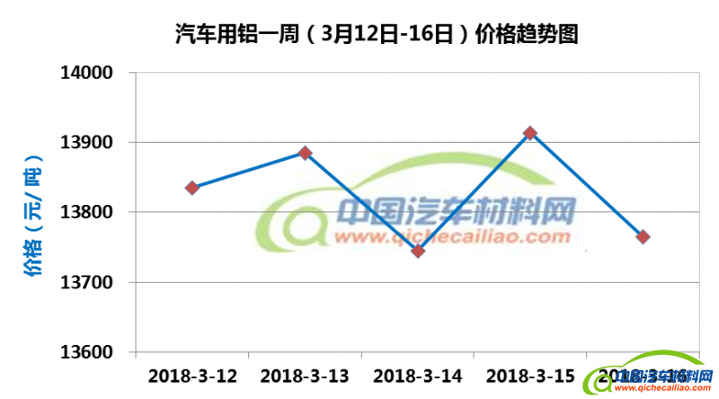 汽车用铝本周内价格波动较大:3月12日-13日,价格小幅上涨;13-14日价格下跌;14-15日价格又有较大幅度回升;15-16日价格再次下跌。汽车用铝本周均价为13829元/吨,较上周下跌2.28%,较2月份均价下跌0.87%。