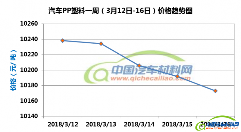 车用PP塑料本周价格持续下跌,一周内跌幅达65元/吨,本周五PP塑料价格跌至10173.15元/吨。车用PP塑料本周均价为10208.67元/吨,较上周下跌0.77%,较2月份均价下跌1.81%。