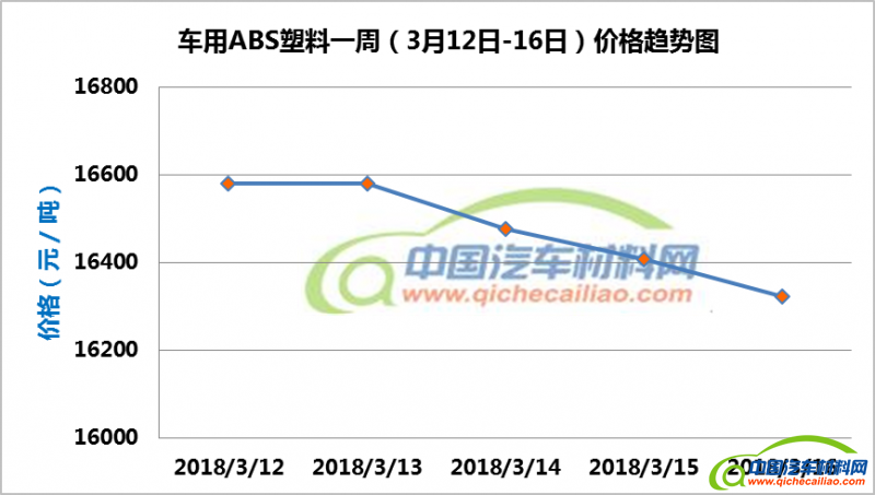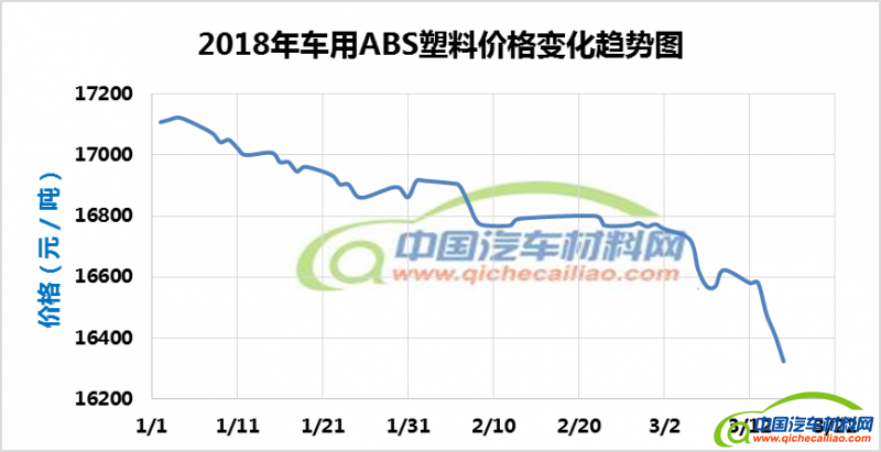 ABS塑料本周价格呈下跌趋势,一周内跌幅达257.69元/吨,本周五ABS塑料价格跌至16323.08元/吨。车用ABS塑料本周均价为16473.97元/吨,较上周下跌0.89%,较2月份均价下跌2.06%。