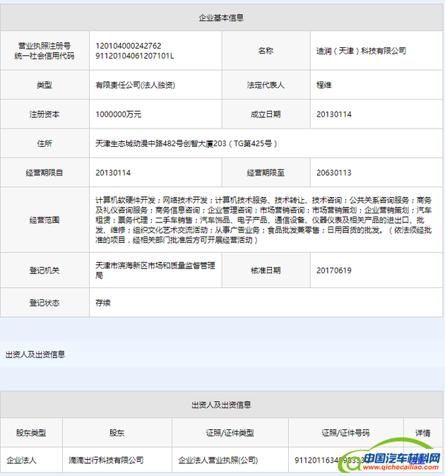 新京报记者注意到,2017年1月,迪润(天津)科技有限公司由为天津市泽锦源太阳能设备有限公司变更而来。与此同时,其经营范围也由经营太阳能类产品,变更为包含计算机软硬件开发、汽车租赁、票务代理、二手车销售等业务。