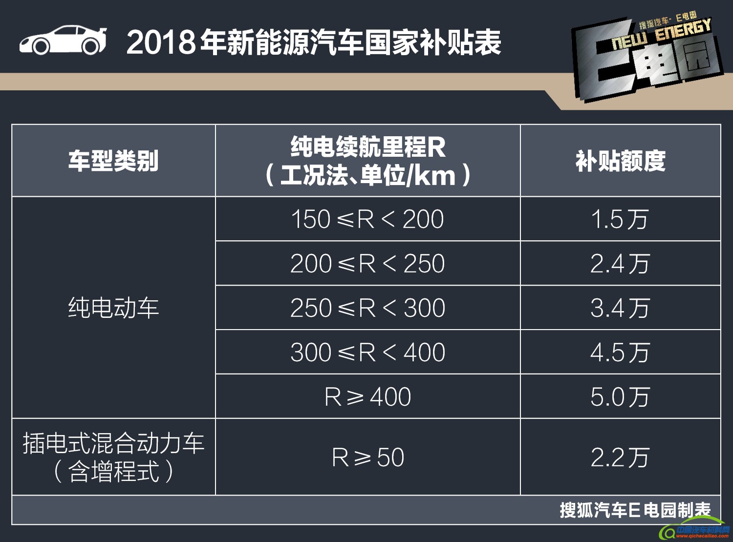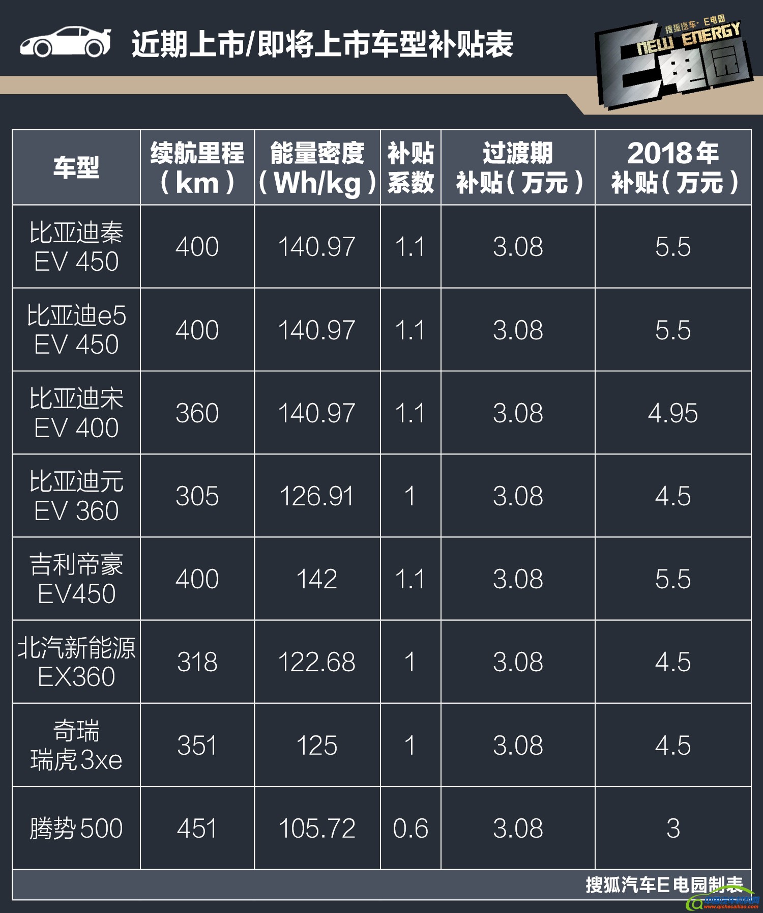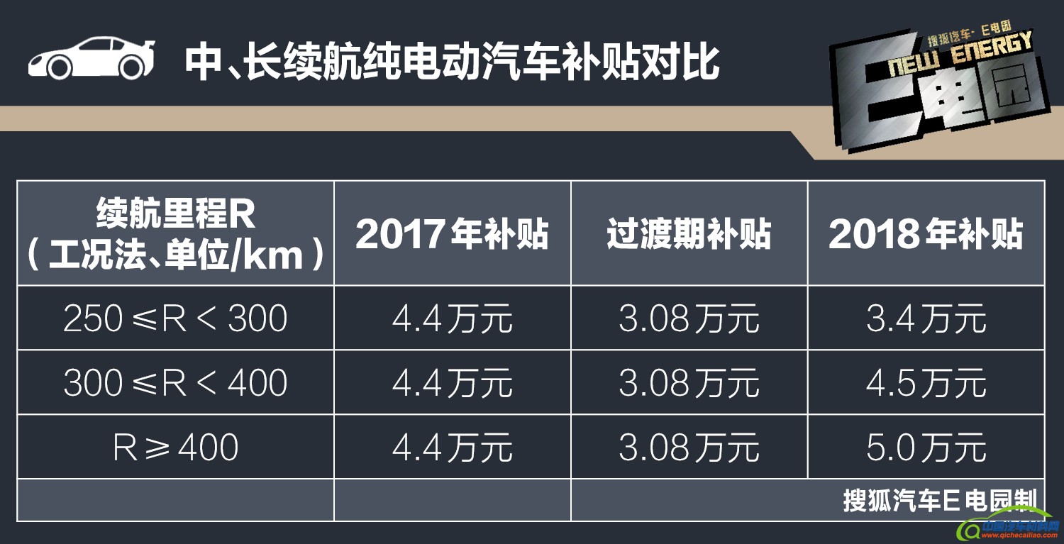 seline; max-width: 100%; display: block; color: rgb(68, 68, 68);" alt="" />代表车型:比亚迪宋 EV400、秦 EV450 、e5 450 、帝豪 EV450、奇瑞 3xe 、元 EV360、北汽 EX360、荣威 ERX5、北汽新能源EU400、腾势 500 等。E点评:由此可见,续航300km是一个分水岭,若车型达不到此标准,竞争力也会随之大幅下降。相应的,补贴上调也可看出国家鼓励中长续航车型的研发和推出,广大消费者也是最直接的福利的享有者。