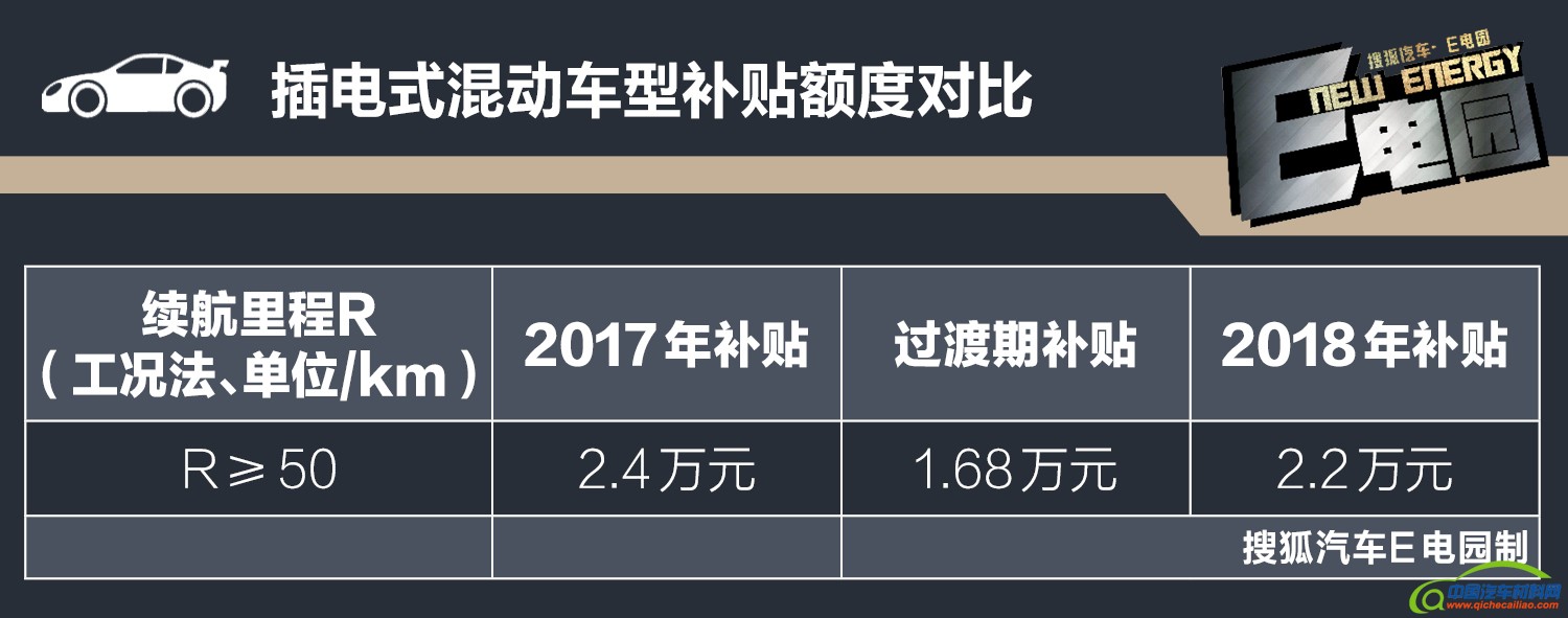 计算了复杂的纯电动汽车补贴情况后,我们再来看看混合动力车型。这类车型的补贴情况较为简单,只要电动续航里程大于(包括等于)50公里,在过渡期可以享有1.68万补贴,而新政策实施后可享有2.2万补贴,价格上调了5200元,想购买混合动力车型的消费者需等两个月再出手。