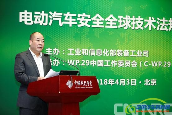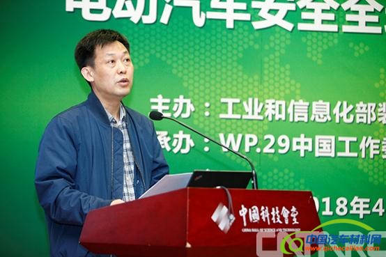 2018年4月3日,由工业和信息化部装备工业司主办、WP.29中国工作委员会承办的电动汽车安全全球技术法规(EVS-GTR)宣贯会在京召开。工业和信息化部装备工业司副司长瞿国春、中汽中心董事长、党委书记于凯、中汽中心职工董事、工会主席、总经理助理文宝忠、比亚迪股份有限公司高级副总裁廉玉波、欧洲汽车工业协会北京代表处首席代表戴麟以及汽车行业200余名专家参加了此次宣贯会。瞿国春为宣贯会致辞,于凯接受相关媒体专访,中汽中心标准所副所长王学平主持会议。