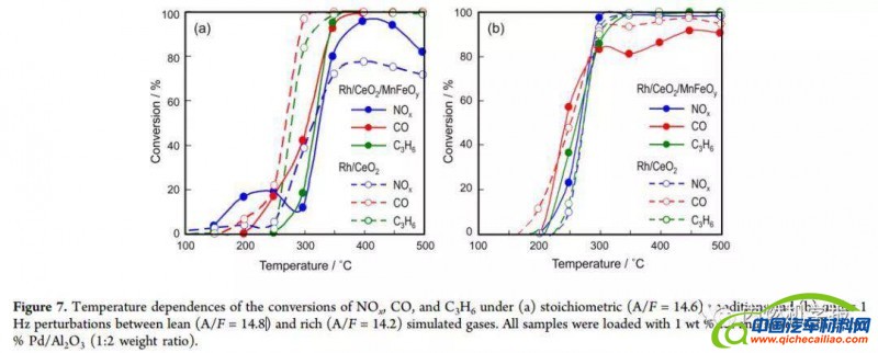 在当量燃烧情况下,新制备的催化剂对CO和C3H6的催化起活温度要高于对比的催化剂,但是明显提高了200-250℃时NOx的催化效率。在有扰动的情况下,新制备的催化剂的起活温度要低于对比催化剂,在较浓或者是较稀的混合气浓度下,新制备的催化剂的催化效率更好。