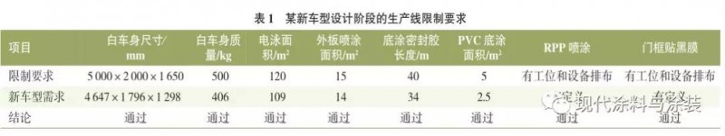 根据现有生产线的基本限制要求,对比新车型的白车身最大外形尺寸、白车身重量、最大电泳面积、最大喷涂面积、底部焊缝密封胶最大长度、PVC喷涂最大面积、RPP喷涂要求、门框贴黑膜要求。若无法满足新车型的需求,则需要对生产线的设备或工艺进行改进。某车型设计阶段的生产线限制要求见表1所列。
