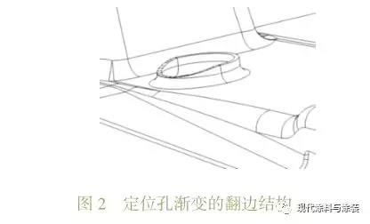 2)现有后定位孔翻边高度不满足滑橇锁紧高度9-10mm的要求,且该锁紧高度要求下,车身设计时采用的普通冷轧板翻边高度达不到要求,需要底部增加一块加强板来增加高度,导致车体重量增加,且板材贴合部位无法形成电泳漆膜,会导致锈蚀问题发生。若更换材质会导致整车成本上升,不建议采用。考虑到定位孔翻边与滑橇锁紧结构接触部位必须保证锁紧高度要求,而其余部位翻边高度对锁紧无影响,故可用渐变的翻边结构(图2所示),保证锁紧部位的高度要求。经过与冲压工程师确认分析,这种方案可行。对比设备图纸和现场测量,确认滑橇的锁紧机构锁紧后与定位孔翻边的接触范围,在保证满足工件强度要求和冲压工艺能实现的前提下,尽量增大最大高度翻边的范围。经过EP样车验证,此定位孔翻边形式锁紧可靠,无变形。