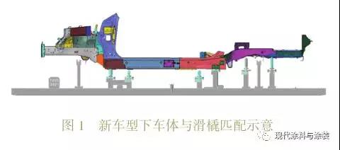 本次共线分析新车型的生产线前处理、电泳采用RoDip的输送方式,且WBS和PBS滑橇定位点与涂装车间滑橇定位点相同。在车身设计初期,需将新车型的定位点坐标、孔径大小和定位孔的翻边高度与滑橇支撑进行匹配。可将新车型的数据和滑橇3D数据组合进行模拟分析,可同时观察车身与滑橇的横梁、支腿等是否存在干涉问题,结果更直观。如果不能匹配现有滑橇支撑,需要增加新的滑橇支撑,或对车身定位孔进行调整。一般优先考虑调整车身定位孔,因新增支撑前需要评估新支撑与现有车型是否干涉、布置新支撑需要的空间能否在滑橇增加该支撑,并且改造滑橇的费用巨大。