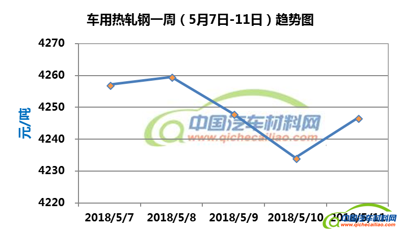 热轧钢本周内价格变化如下:5月7日-10日,价格下跌,跌幅为25.42元/吨;5月10日-11日,价格回升,11日升至4246.67元/吨。车用热轧钢本周平均价格为4249.6元/吨,较4月份均价上涨2.68%。