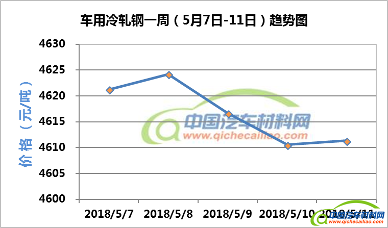 冷轧钢本周价格变化如下:5月7日-8日,价格上涨,涨幅为2.95元/吨;5月8日-11日持续下跌,跌幅为12.88元/吨。车用冷轧钢本周平均价格为4615.7元/吨,较4月份均价下跌 1.04%。