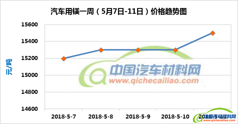 汽车用镁本周价格稳中有升,一周内有200元/吨的小幅增长。汽车用镁本周均价为15320元/吨,较4月份均价上涨1.51%。